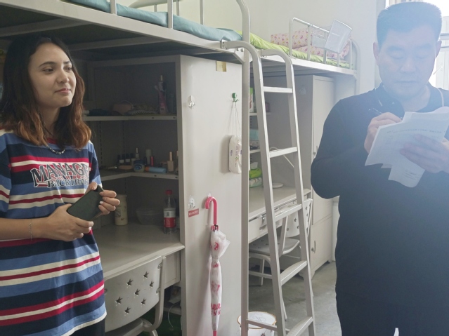 接着,评委老师走进研究生女生宿舍,以“民族团结一家亲”为主题的909宿舍吸引到了在场的所有评委老师。维吾尔族同学夏阿代提说:“我们宿舍虽然是民汉合宿,但我们相处地非常融洽,在这样的氛围里我将会度过一个愉快的研究生生活。”