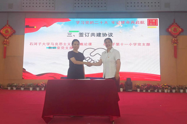 在红领巾讲解员的带领下,概论课教研室党支部参观了第十一小学的石榴籽雕塑、民族团结连心亭、公司特色足球文化展示墙、幸福石榴籽劳动实践基地、民族团结幸福靶场等地。随后,在梦之馆开展了共建交流活动,并为第十一小学党支部的教师们开展了四场微党课。最后,两个支部签订了共建协议。