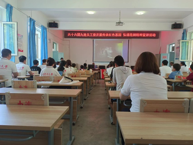 7月17日,团队到达六十六团九连,参加由九连关工委开展的“传承红色基因 弘扬亮剑精神”的主题宣讲活动。在退休民警李质龙的讲述中,我们进一步了解第四师六十六团的历史。六十六团是一个有着光荣革命传统的老团场,有着深厚的红色文化历史底蕴,前身是组建于1938年八路军一二九师三八六旅新一团,朱德总司令曾为新一团题词“模范青年团”。1940年新一团更名为十六团,参加了由时任八路军副总司令彭德怀指挥的“百团大战”,并打响了第一枪。电视剧《亮剑》中“独立团”在抗日战争时期的战斗经历就是十六团的战争史。亮剑精神体现了一种勇气、一种魄力,即使面对强大的对手,明知不敌,也要毅然亮剑,即使倒下,也要成为一座山、一道岭!新时代的兵团人和新青年要保持战略定力、发扬斗争精神,以永不言败的信心赓续红色基因,将亮剑精神代代相传。