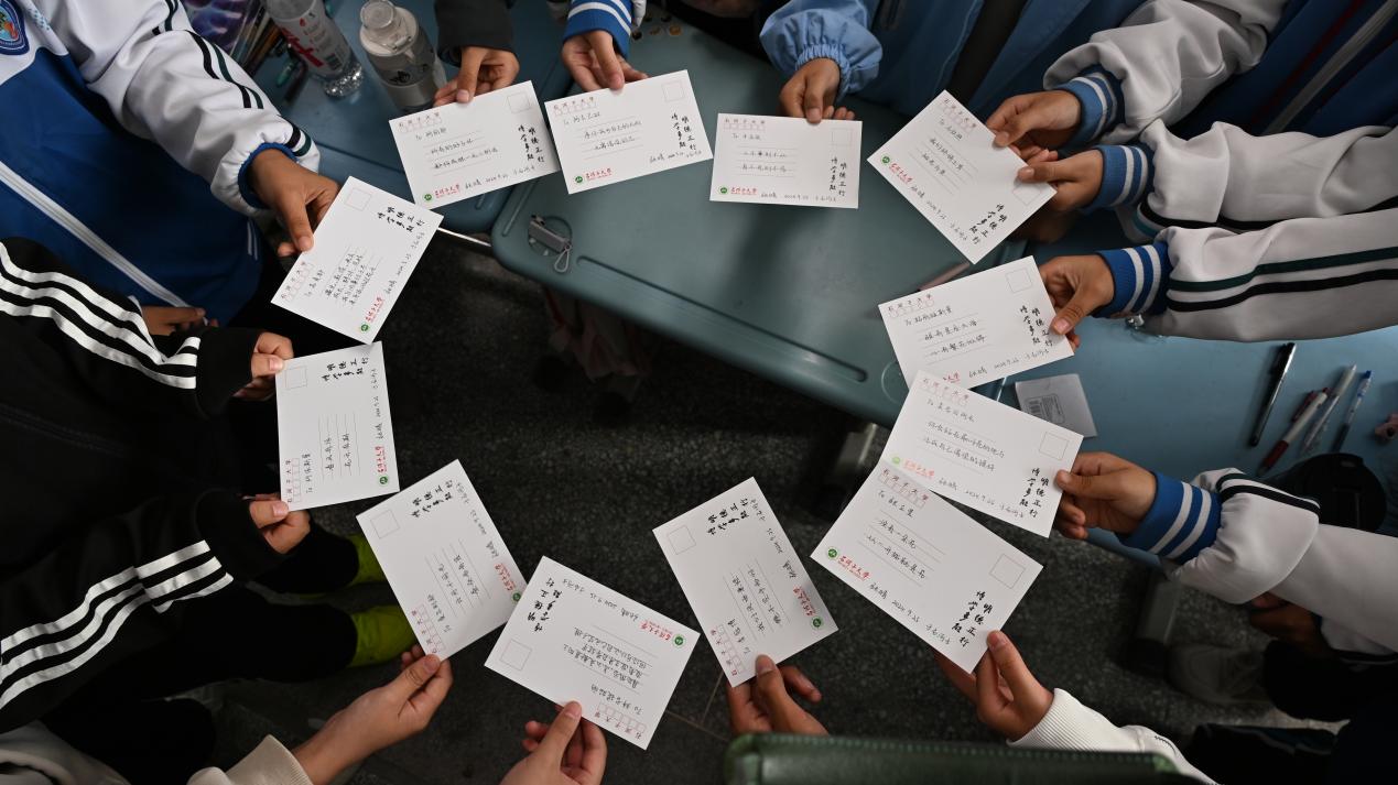 上午第三节课课间,我到班里给员工发明信片,我微笑地看着每一