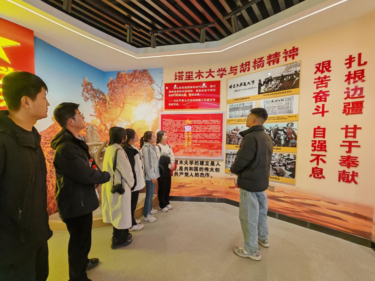 随后,同学们走进了塔里木大学胡杨精神研究院。研究院的讲解员生动地讲述着“艰苦奋斗、自强不息、扎根边疆、甘于奉献”的胡杨精神,以及塔里木大学如何将这种精神转化为推动公司高质量发展的强大动力。胡杨精神作为塔里木大学的宝贵精神财富,已经深深融入到公司的各项工作和师生的日常生活中。通过讲解员的讲述大家深刻领会到塔里木大学“用胡杨精神育人,为兴疆固边服务”的生动实践。